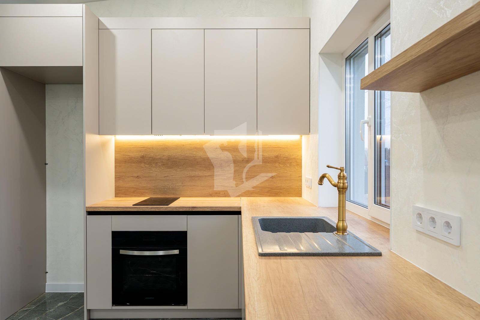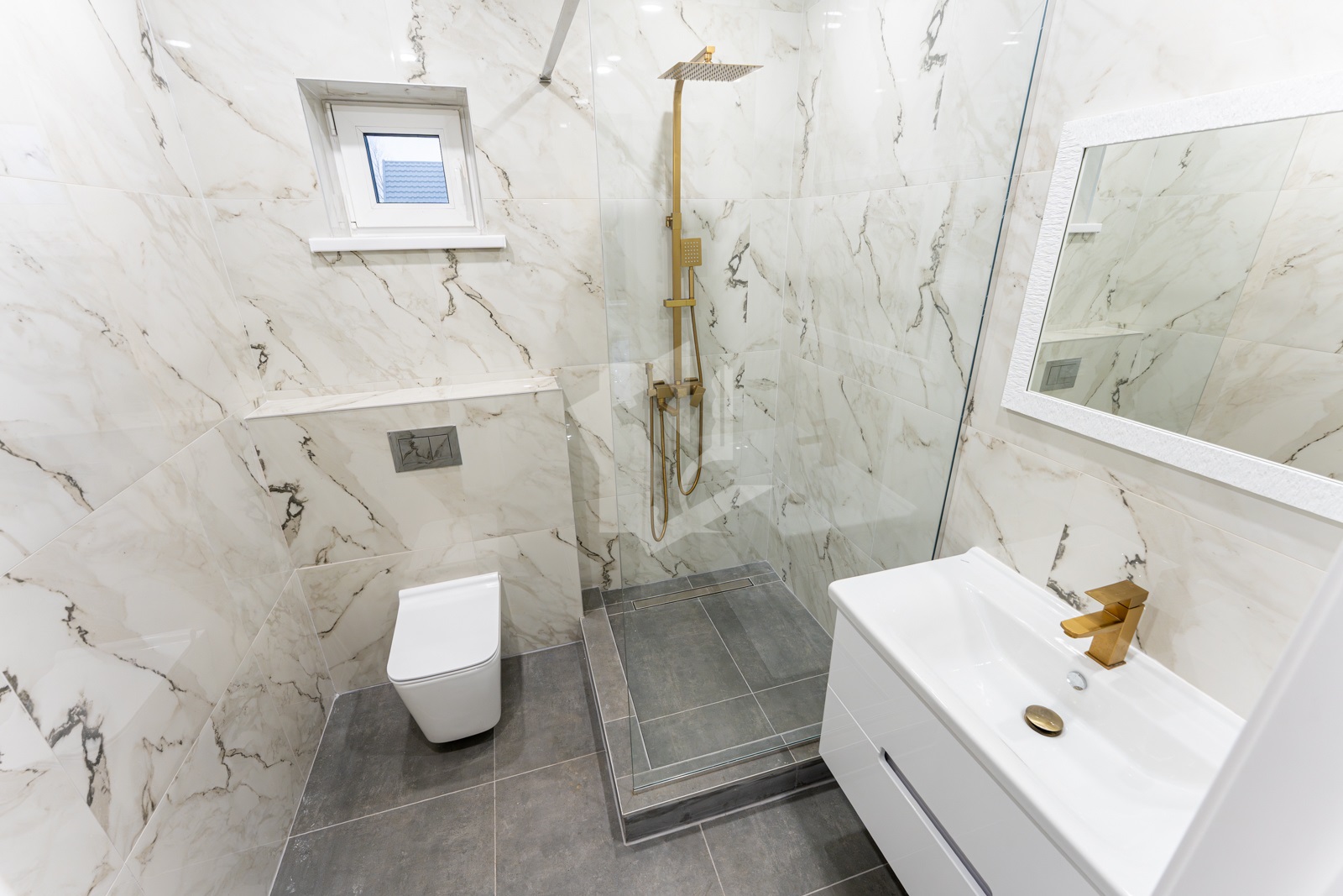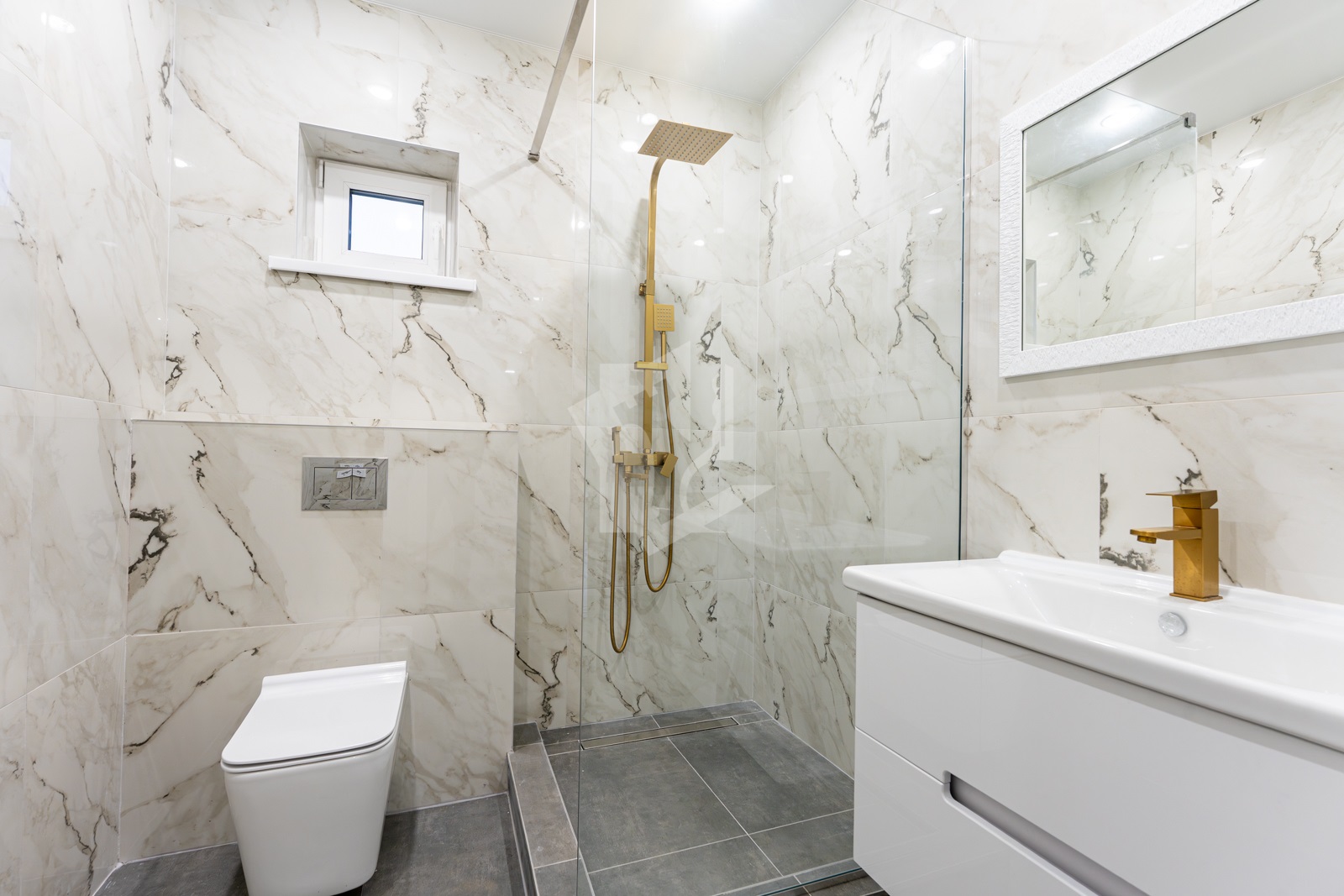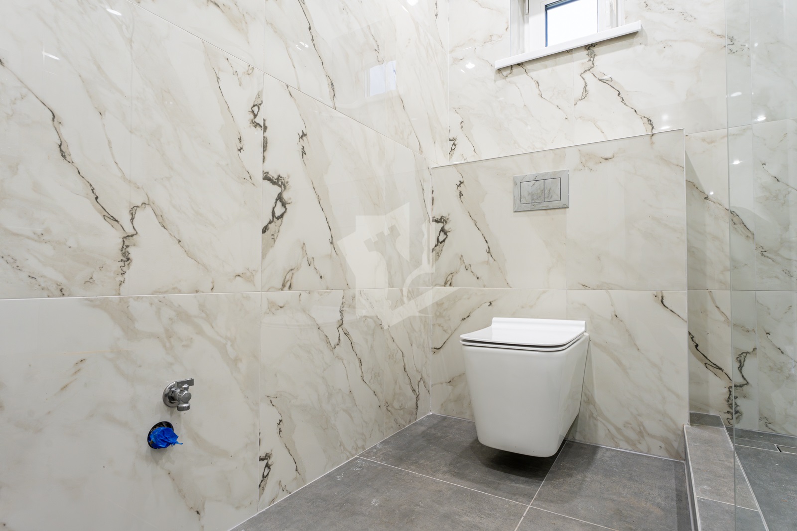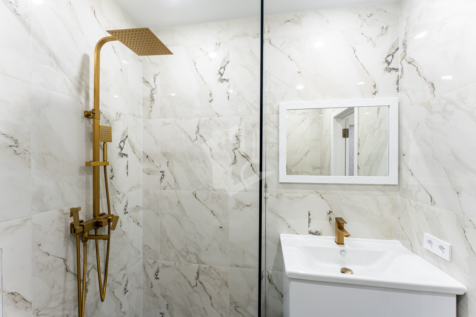 На полу – крупноформатный керамогранит. Роскошный мраморный рисунок придаёт ещё больше объёма пространству.